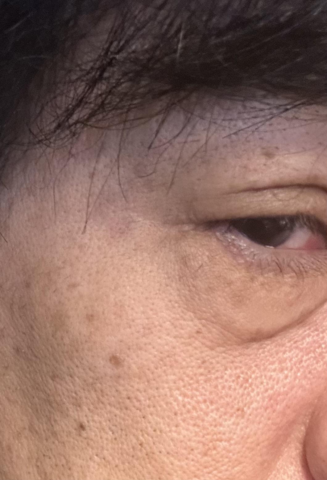 他のシミは【茶色(薄い・濃い)】ですが、目の横にあるのは【赤く】見えます。