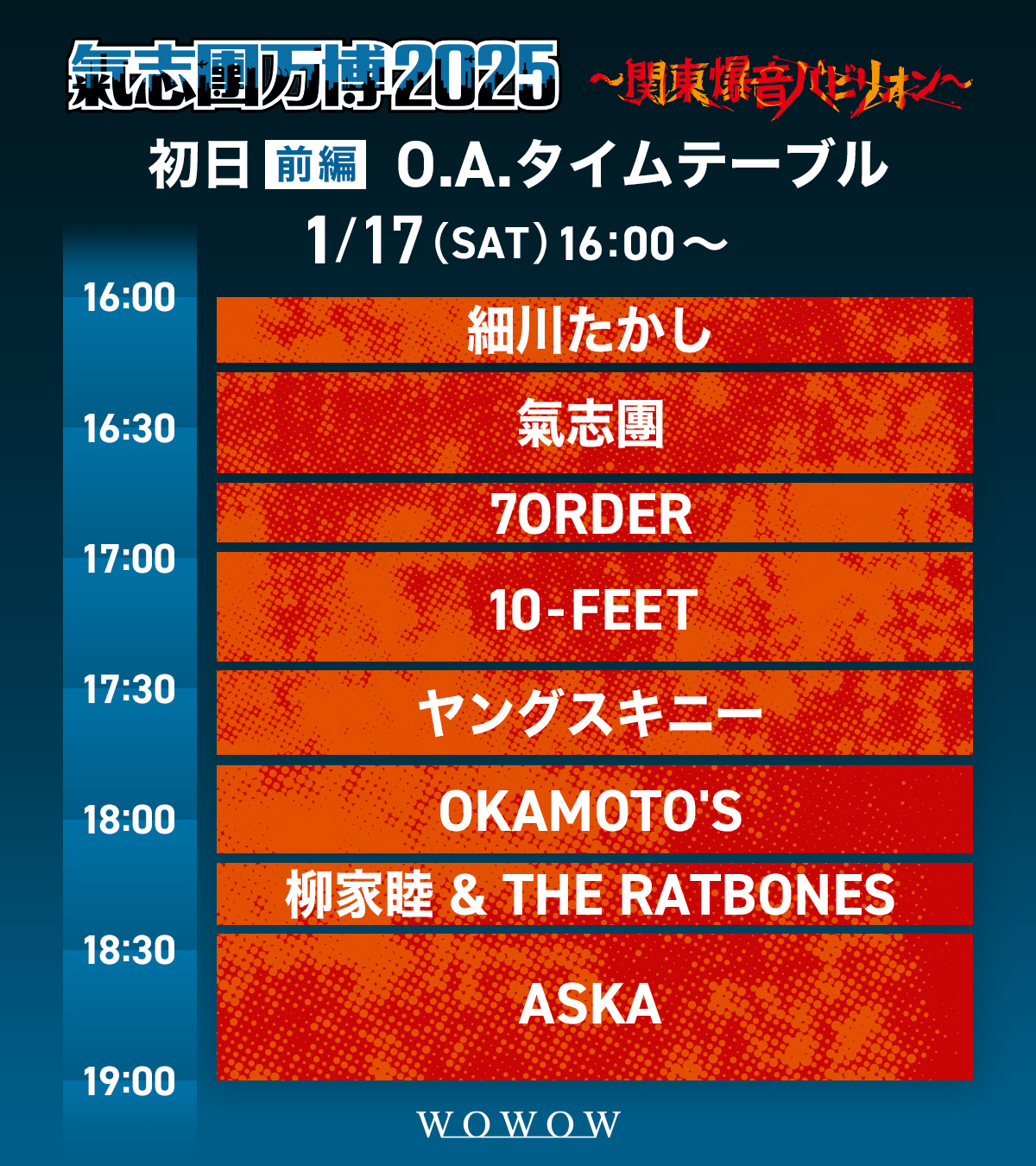 出演:細川たかし <OPENING CEREMONY ACT>、氣志團、7ORDER、10-FEET、ヤングスキニー、OKAMOTO'S、柳家睦&THE RATBONES <WELCOME ACT>、ASKA